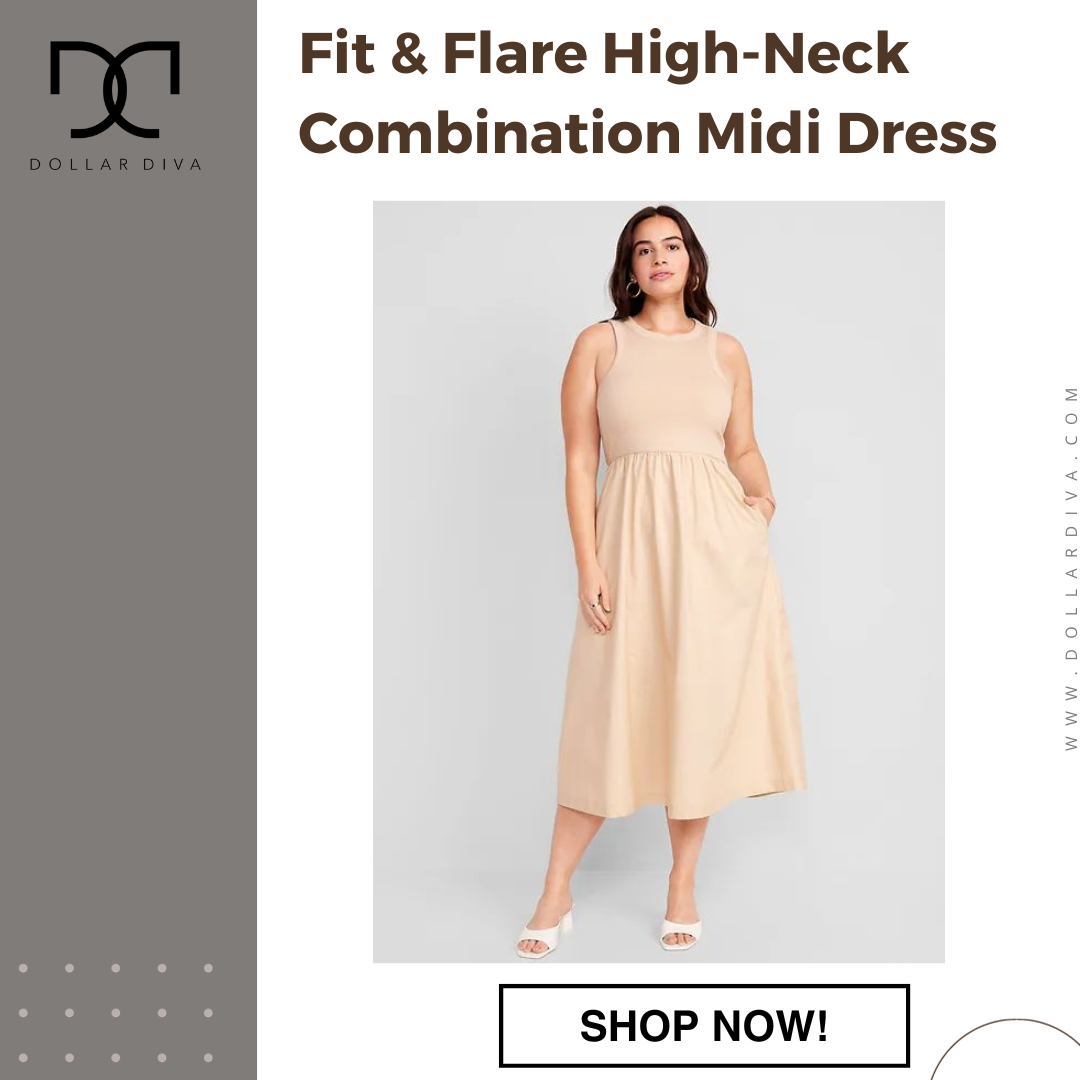 Fit & Flare High-Neck Combination Midi Dress
